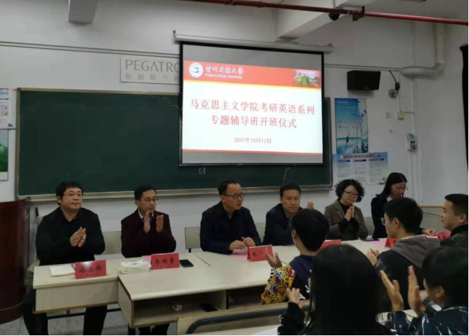 为进一步支持学生考研,克服考研英语障碍,提高研究生录取率,公海·赌船(中国)唯一官方网站 于2021年10月12日19:00在15栋教学楼608教室召开公海·赌船(中国)唯一官方网站 考研英语系列专题辅导讲座开班仪式。外国语公海·赌船 副院长张广勇、赵艳老师、尹可秀老师,公海·赌船(中国)唯一官方网站 党委副书记(主持工作)徐勤山、考研辅导班班主任冯志伟老师出席,各年级思想政治教育专业有考研意向的学生40余人参加,开班仪式由公海·赌船(中国)唯一官方网站 副院长李昭勇主持。