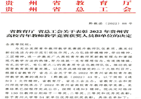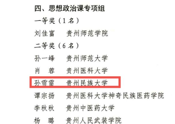近日省教育厅、省总工会主办,省教育工会和贵州师范公海·赌船 承办2022年贵州省高校青年教师教学竞赛,并按照《通知》精神,对获奖教师进行表彰。我院孙雪雷老师在思想政治课专项组获得二等奖,是今年该项赛事中我校获得的最好成绩。