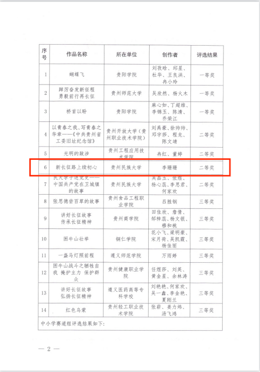 近日,省教育厅组织开展了“薪火黔行故事汇”——讲好长征故事微视频征集活动。此次活动共收到参赛视频116个,其中高校赛道组参赛视频56个,中小学赛道组参赛视频60个。经各市(州)教育局和各高校推荐、专家评选、公示无异议等环节,我院2021级学生李珊珊的作品《新长征路上续初心》荣获二等奖。