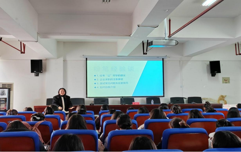陈明老师从其准备参加公务员考试的建议、企业求职注意事项、面试常见问题及应答技巧等方面作详细介绍,并对学生提出的关于面试疑问进行解答。